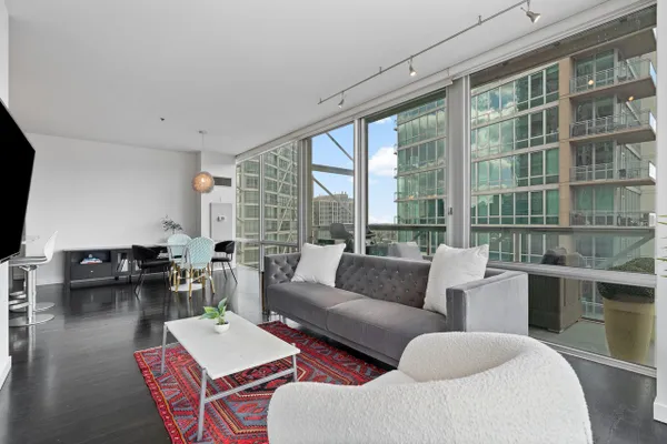 Rarely available northeast corner residence in one of River North's premier boutique buildings, showcasing sweeping city views through dramatic floor-to-ceiling windows. This refined 2-bedroom, 2-bath home offers a light-filled, open-concept layout with generous proportions and seamless flow for both living and entertaining. The Bulthaup kitchen is thoughtfully designed with a substantial island, quartz countertops, integrated storage, and upgraded stainless steel appliances, balancing clean design with everyday functionality. The primary suite is a true retreat, featuring a large walk-in closet and a beautiful bath with double vanity, soaking tub, and separate glass-enclosed shower. The second bedroom is elevated with integrated lighting, and a built-in Murphy bed, offering flexibility for guests or a polished home office. Additional highlights include an oversized private balcony, in-unit laundry, custom lighting, tailored window treatments, and dedicated storage. Garage parking available for $35,000. Full-service, pet-friendly building with 24-hour door staff, fitness center, and storage. Ideally positioned in River North, just moments from East Bank Club, Montgomery Ward Park and dog park, the Riverwalk, and the neighborhood's best dining, shopping, and transportation.