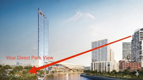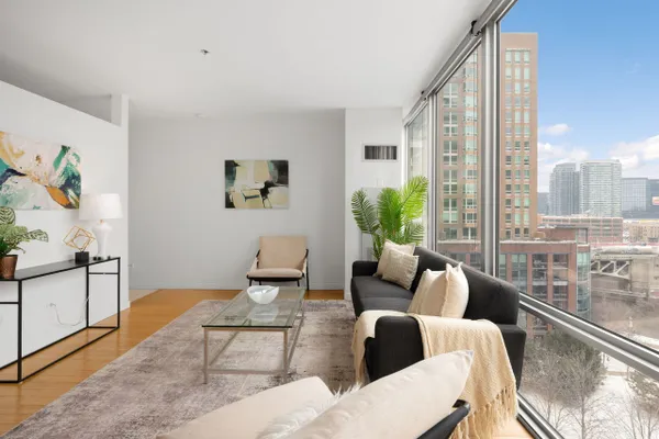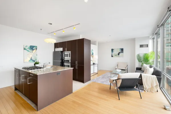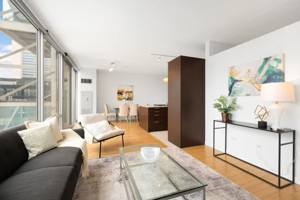 Bright and architecturally significant, this 1-bedroom plus den, 1.5-bath residence at Kingsbury on the Park includes one heated garage parking space and defines sophisticated urban living. Floor-to-ceiling windows flood the open-concept layout with brilliant western light and gorgeous sunsets over the Chicago River. The interior features handsome bamboo flooring and a chef-inspired kitchen with a massive island, perfect for hosting against a backdrop of the water. A dedicated den offers a quiet workspace, while the primary suite serves as a private retreat with a custom-organized walk-in closet and en-suite bath. Enjoy in-unit laundry, a private balcony, and full-service amenities including 24-hour door staff, a fitness center, and a newly renovated lobby. Ideally located moments from the East Bank Club, CTA Brown & Purple Lines, and the expressway, this home is a premier investment on the cusp of a world-class neighborhood evolution. Your view overlooks the greenest chapter of the expansion: a new 2-acre public park and 2,000-foot Riverwalk extension. With the hotel tower strategically offset, you enjoy open skies and lush park vistas; the ultimate mix of residential tranquility and future value.