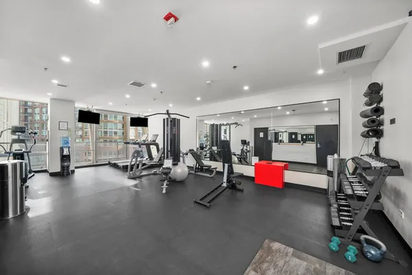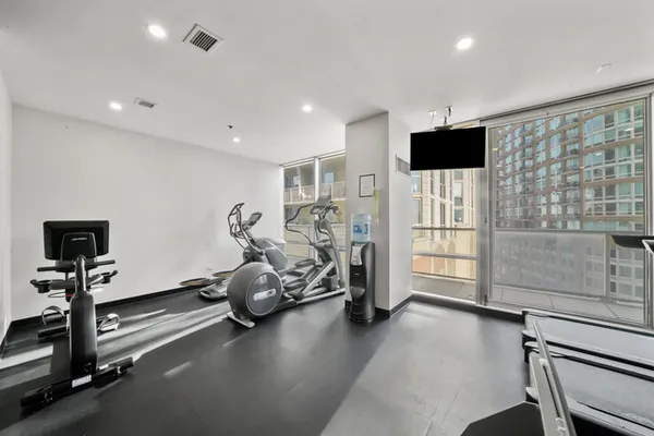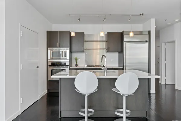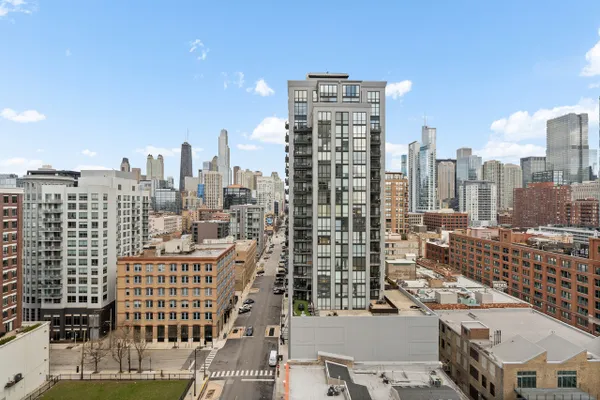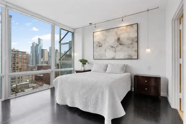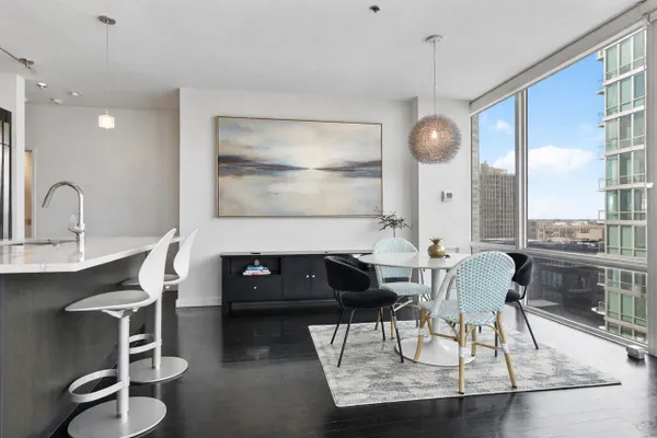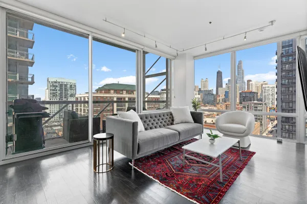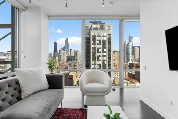 Rarely available northeast corner residence in one of River North's premier boutique buildings, showcasing sweeping city views through dramatic floor-to-ceiling windows. This refined 2-bedroom, 2-bath home offers a light-filled, open-concept layout with generous proportions and seamless flow for both living and entertaining. The Bulthaup kitchen is thoughtfully designed with a substantial island, quartz countertops, integrated storage, and upgraded stainless steel appliances, balancing clean design with everyday functionality. The primary suite is a true retreat, featuring a large walk-in closet and a beautiful bath with double vanity, soaking tub, and separate glass-enclosed shower. The second bedroom is elevated with integrated lighting, and a built-in Murphy bed, offering flexibility for guests or a polished home office. Additional highlights include an oversized private balcony, in-unit laundry, custom lighting, tailored window treatments, and dedicated storage. Garage parking available for $35,000. Full-service, pet-friendly building with 24-hour door staff, fitness center, and storage. Ideally positioned in River North, just moments from East Bank Club, Montgomery Ward Park and dog park, the Riverwalk, and the neighborhood's best dining, shopping, and transportation.